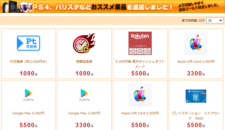 景品ごとに必要なG(ポイント)は異なりますが、目安としては以下の通りです。
