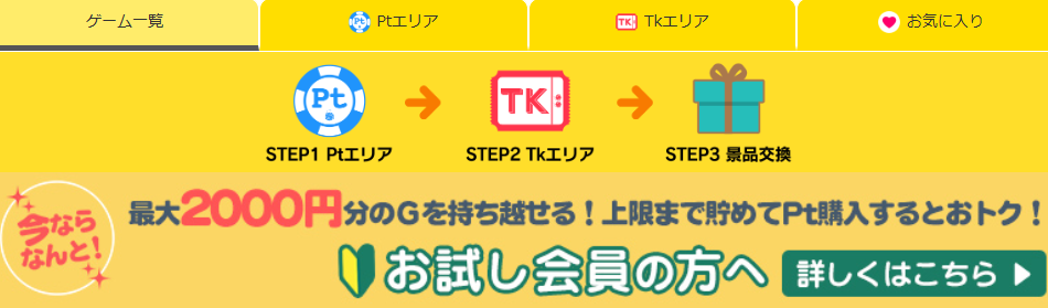 見た目はオンラインスロットですが、実際にはPt → チケット → GOLDという段階を踏みながら進んでいく仕組みになっています。GOLDは景品交換に使う通貨で、チケットはチケットエリアのゲーム参加に使われます。